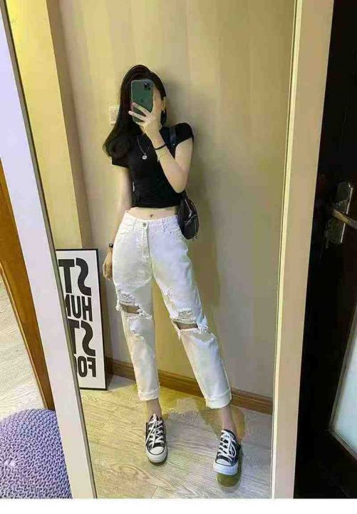 早秋新款洗水棉女装破洞宽松高腰乞丐显瘦牛仔老爹裤,独立包装带腰卡,码数...