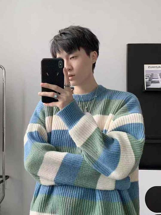 秋冬季慵懒风情侣百搭条纹宽松圆领毛衣,男女同款,100件,M-2XL,独立包装...