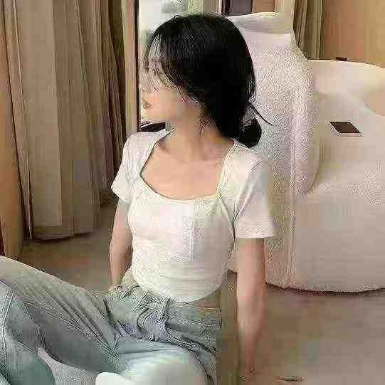 全清4.8元,数量800件,纯欲露背短袖T恤方领修身露锁骨显瘦,黑色为主,其...