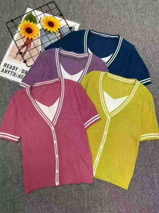 夏季新款高级正肩v领假两件单排扣宽松小香风短袖针织衫,独立包装,均码面...
