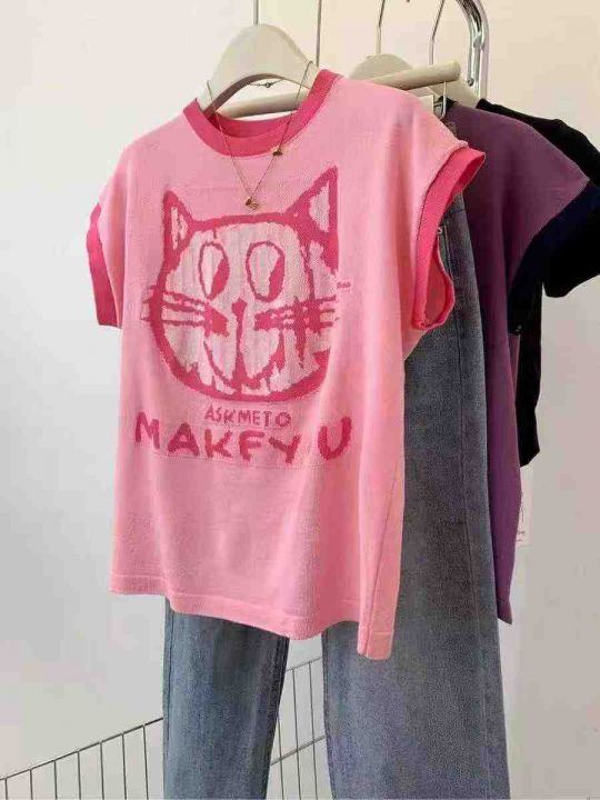 夏季新款时尚设计感拼色猫咪提花宽松慵懒风显瘦落肩针织小衫,独立包装,均...