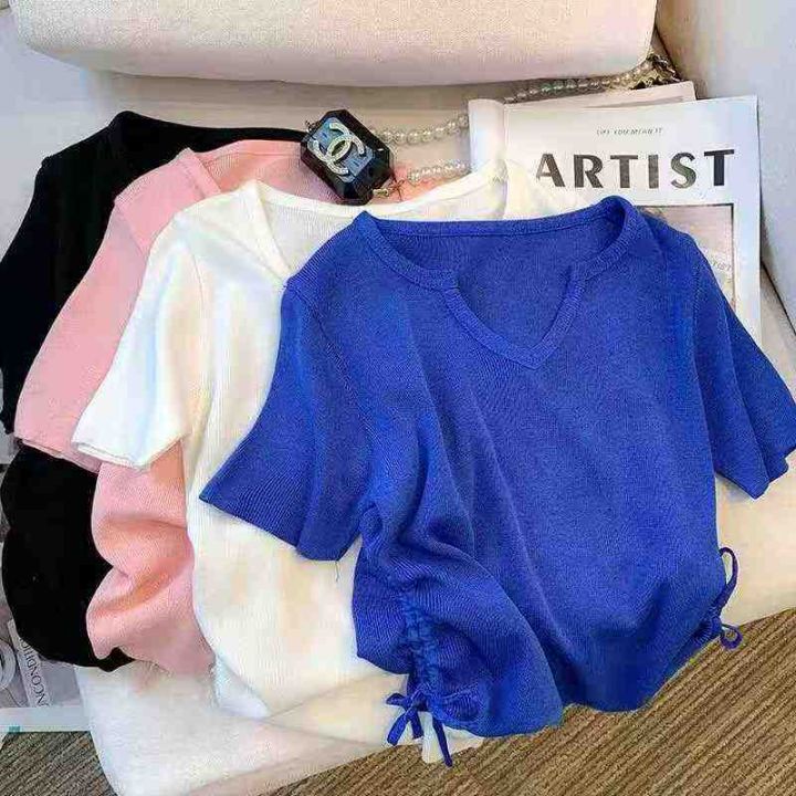夏季新款半开v领设计感抽绳收腰显瘦冰丝针织衫,独立包装,均码面料柔软舒...