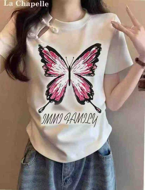 夏季新款新中式盘扣复古蝴蝶爱心印花弹力修身显瘦针织短袖T桖,独立包装,...