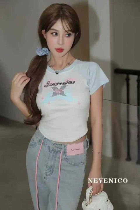 清7.5分货➕1甜酷蝴蝶拼色插肩短袖t恤女,带弹力,数量450件,码数S-XL,独...