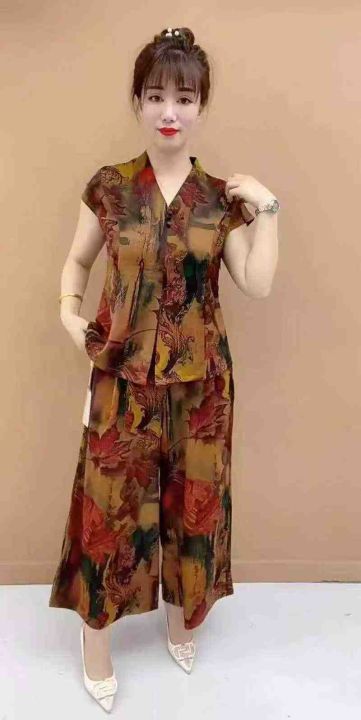中年妈妈装两件套短袖上衣搭高腰阔腿裤,数量:90套,码数:S-M-L-XL,有独...
