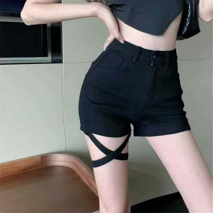 夏季新款港味设计感性感辣妹绑腿弹力修身显瘦百搭洗水棉牛仔短裤,独立包装...