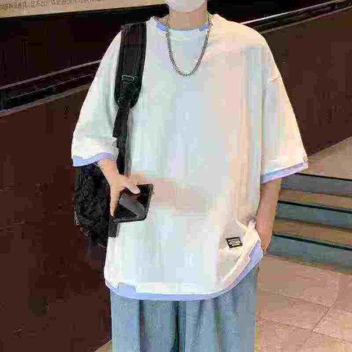 假两件宽松纯棉T恤,男港风潮流百搭痞帅落肩大板T,438件,M-5XL,黄色为主...