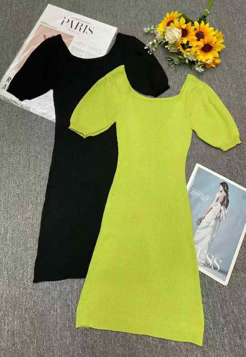 夏季新款法式减龄泡泡袖短袖弹力修身显瘦针织连衣裙,黑色多,独立包装,33...