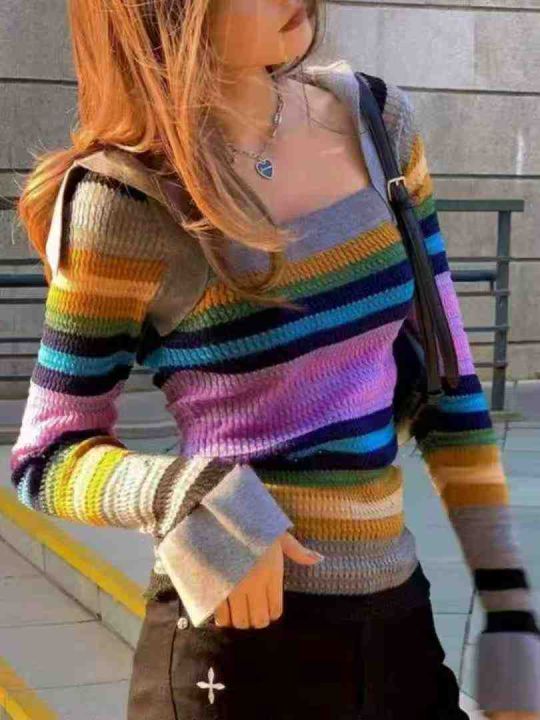 公司原单品牌女装春秋新款长袖方领条纹弹力修身显瘦别致时尚洋气包芯纱套头...