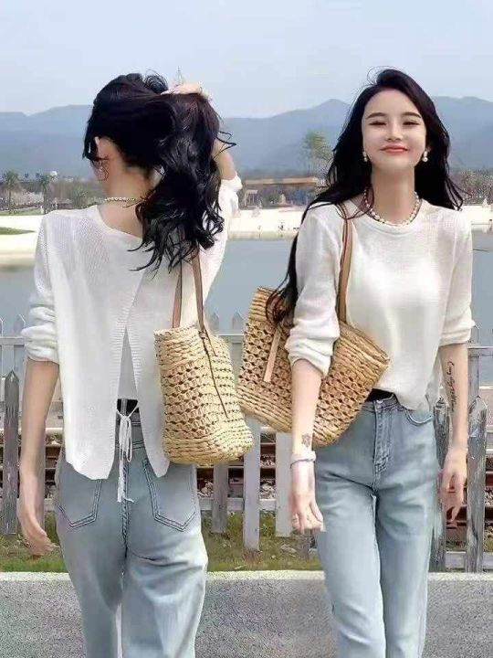 夏季新款时尚设计感后背开叉冰丝长袖针织小衫,独立包装,均码宽松款面料柔...