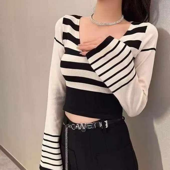 秋季新款纯欲甜辣妹条纹短款v领长袖针套头毛衣,独立包装,单款4色,均码面...