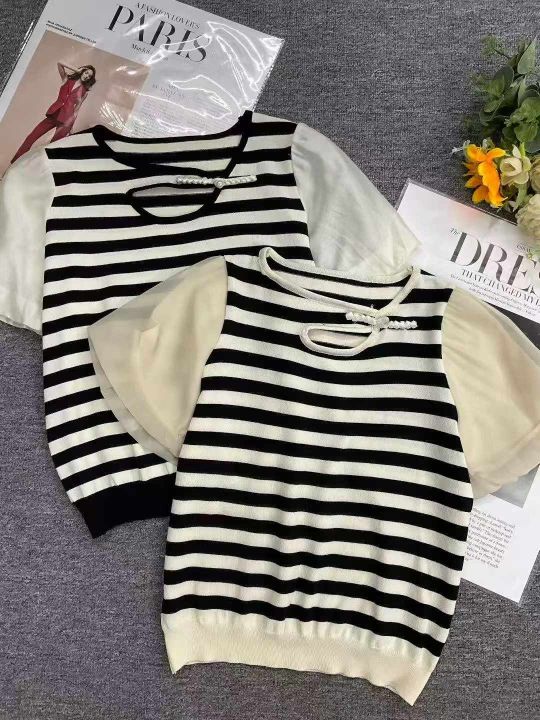 夏季新款新中式国风盘扣拼接泡泡袖条纹针织短袖,独立包装,单款2色,均码...