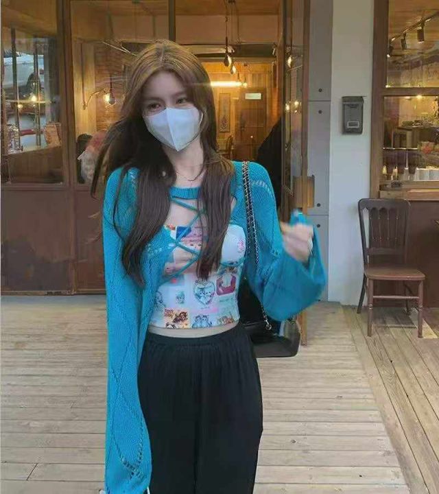 早秋新款纯欲辣妹性感绑带2面可穿设计感小众长袖针织小衫,独立包装,均码...