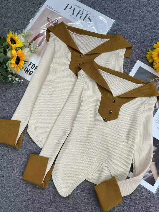 秋季新款纯欲甜辣妹polo领撞色不规则针织套头毛衣,独立包装,均码面料柔软...