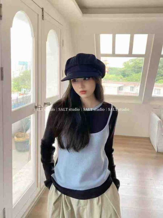 女装早秋新款复古港风chic叠穿v领针织吊带背心马甲+包芯纱套头毛衣2件套, ...