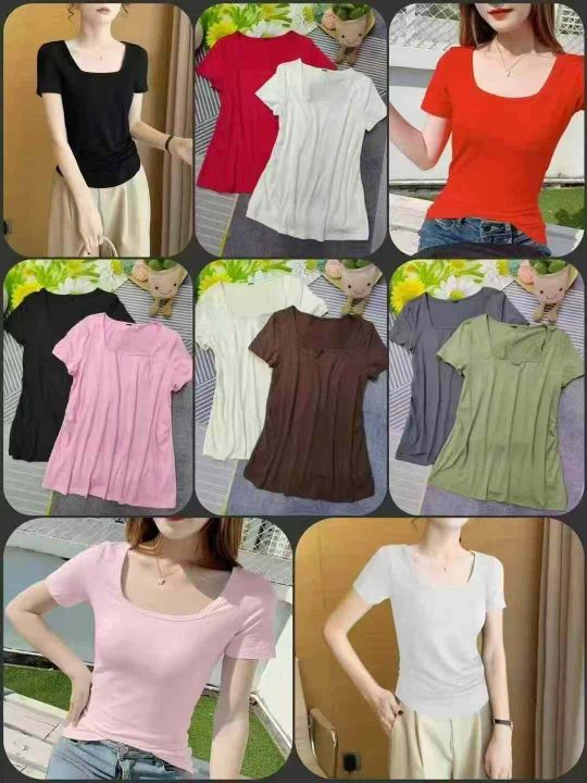 4500件韩版正肩方领简约短袖上衣女夏修身通勤漏肚脐短款收腰褶皱T恤 XS一4X...
