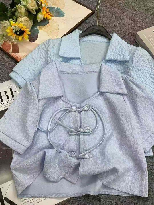 夏季新款新中式国风盘扣法式polo领改良短款雪纺小衫,独立包装,均码,70件...