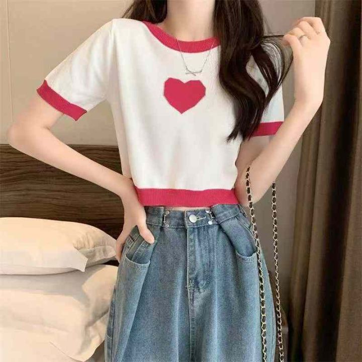 夏季新款设计感撞色爱心正肩甜辣宽松针织短袖,独立包装,均码面料柔软舒适...