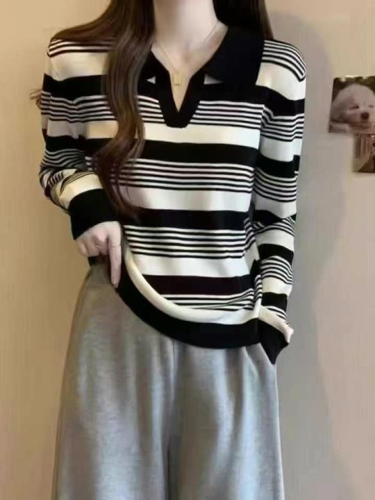 捡漏款,早秋新款韩版正肩翻领polo领撞色条纹长袖针织套头毛衣,独立包装,...