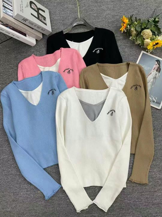 早秋新款女装假两件拼接字母刺绣长袖针织衫,独立包装,均码面料柔软舒适弹...