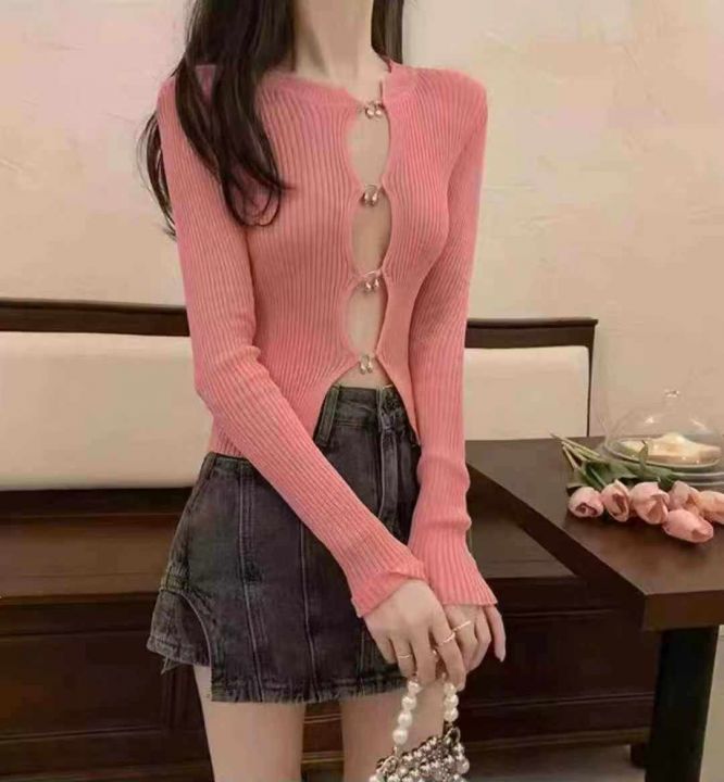 秋季新款美式辣妹镂空长袖弹力修身显瘦性感纯欲针织套头毛衣,独立包装有垫...