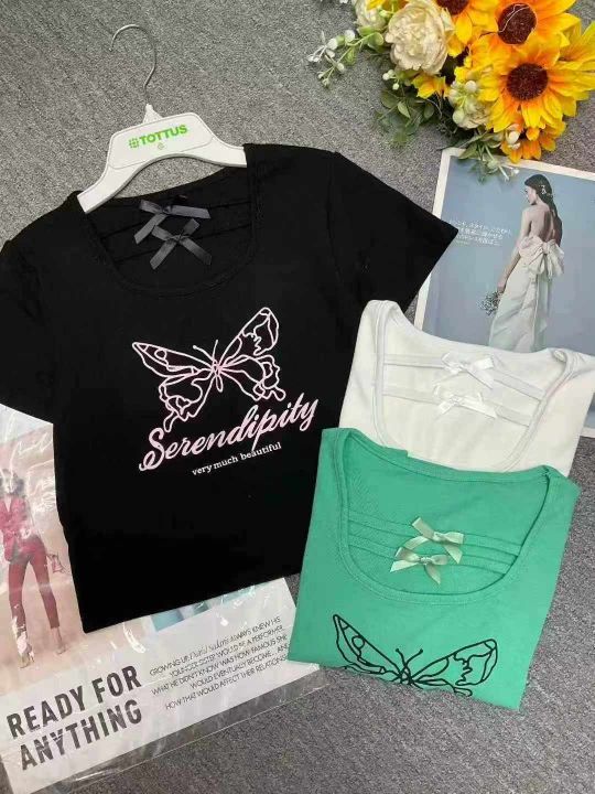 夏季新款甜辣妹绝美设计感小众蝴蝶印花u领弹力修身显瘦棉T桖,独立包装,均...