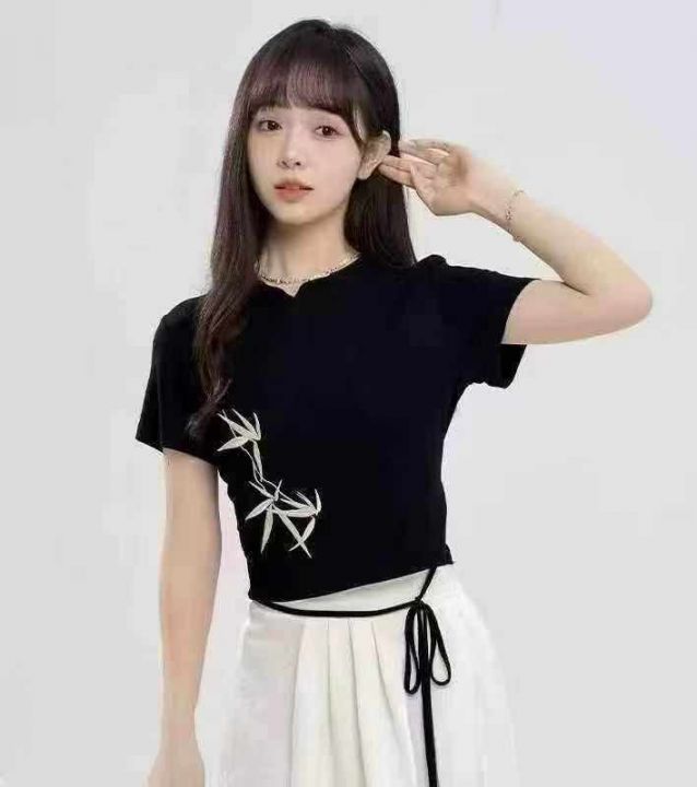[月亮]:6.8秒杀清190件(不分货)[月亮]:新中式刺绣绑带设计辣妹包边T恤[...