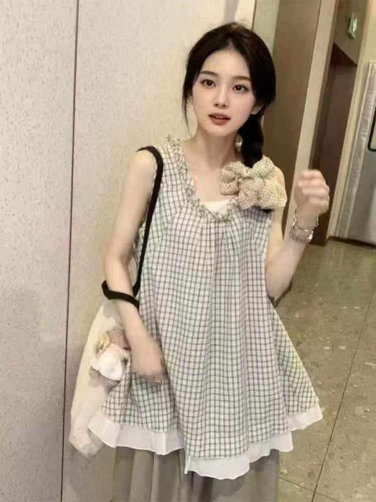 韩系复古无袖上衣170件6.9,格子花领口,拼接设计,码数2-3码,独立包装...