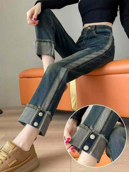 ☕️新款高弹力毛边烟管裤简约拼接撞色腰直筒窄版牛仔裤女九分裤150条全清1...