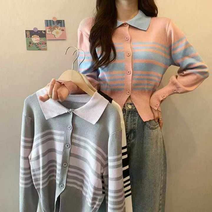 秋装新款设计感撞色洋气韩版polo领别致针织毛衣开衫,独立包装,均码面料柔...