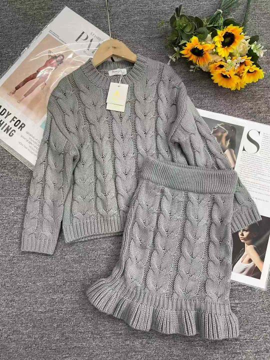 秋冬新款韩版童装麻花纹加厚粗针圆领套头毛衣+麻花纹加厚粗针荷叶边半身毛...