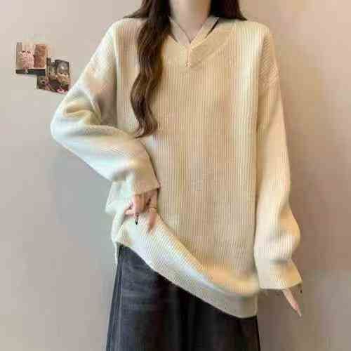 91件气质v领套头毛衣女慵懒针织衫加厚宽松外穿设计感中长款上衣,均码,厚...