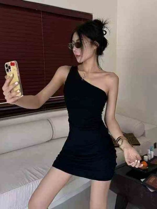 8.8清658件时髦名媛大牌褶皱设计感/斜肩无袖连衣裙包臀裙短裙女春夏 码数M-...