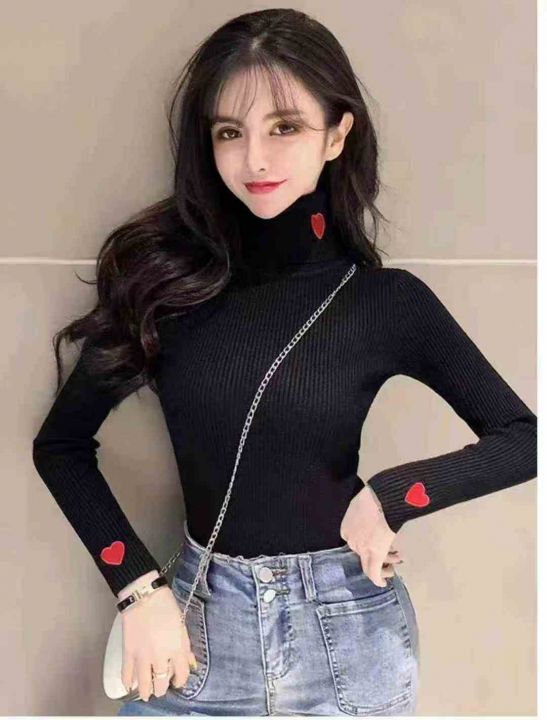 包芯纱气质洋气修身内搭高领半高领毛衣潮爱心刺绣针织打底衫,独立包装,高...