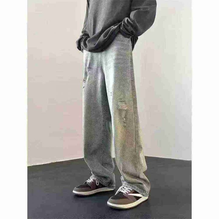 上新全清:18.8一件复古黄泥做旧破洞设计宽松百搭潮牌牛仔裤,[爱心]30件左...