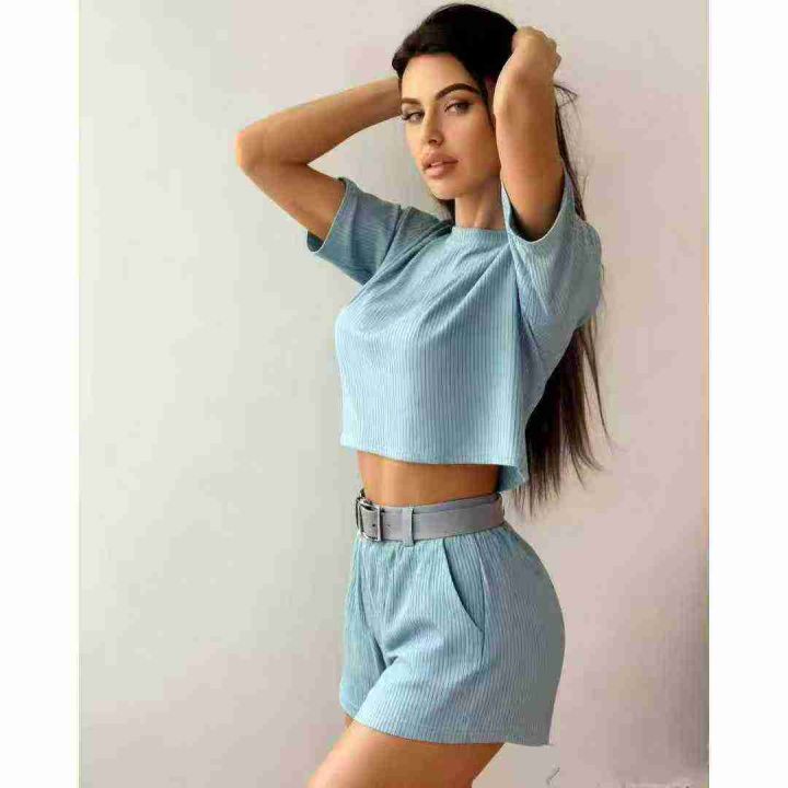 3.9清工厂回收262件外贸热卖设计感时尚套装雾霾蓝短袖短裤两件套,码数XL-4...