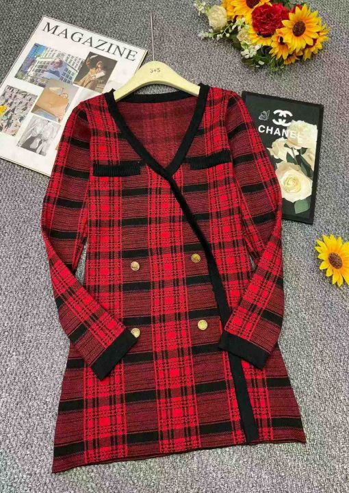 捡漏款,秋冬新款复古红色格纹小香风双排扣针织毛衣连衣裙,独立包装,均码...