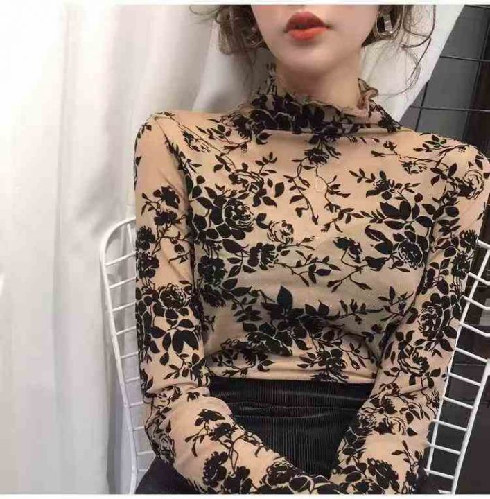 5.8清294件春秋植绒碎花半高领蕾丝打底衫女性感木耳边网纱内搭纱衣 码数S-2...