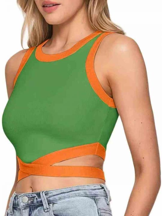 3.8清214件 夏季热卖新品拼接色女装超短款性感时尚小背心螺纹绑绳露脐装 码...
