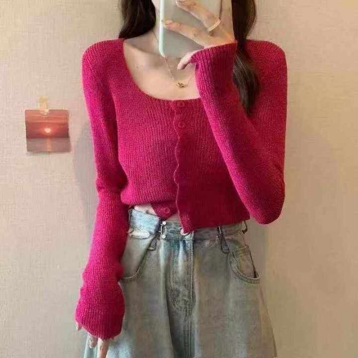 捡漏款,纯欲风春秋新款韩系气质方领弹力修身显瘦短款针织毛衣开衫,独立包...