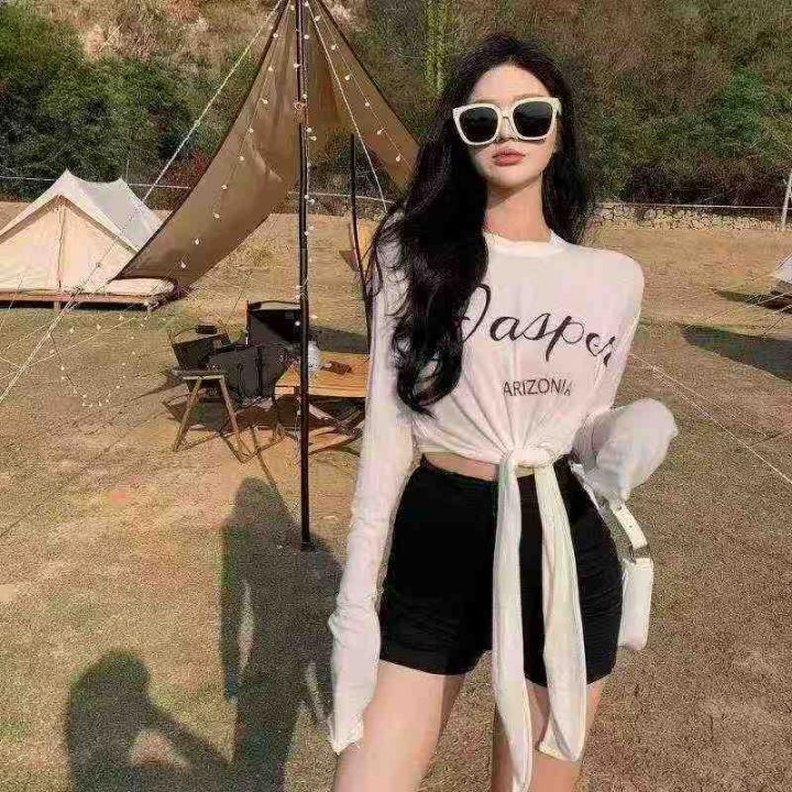 882件夏季热卖甜酷薄款开叉长袖正肩显瘦T恤女辣妹宽松百搭冰丝防晒罩衫上衣...
