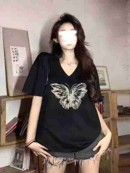 2.5清电商仓回收583件靓妹设计款印花宽松显瘦落肩V领T恤,码数S-2XL。面料...