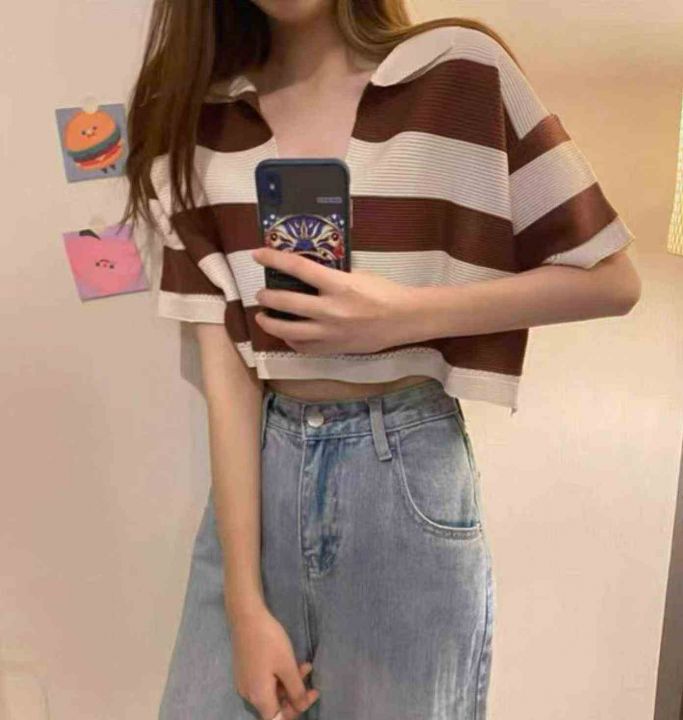 夏季新款撞色条纹宽松短款Polo领针织短袖,独立包装,均码年龄柔软舒适,16...