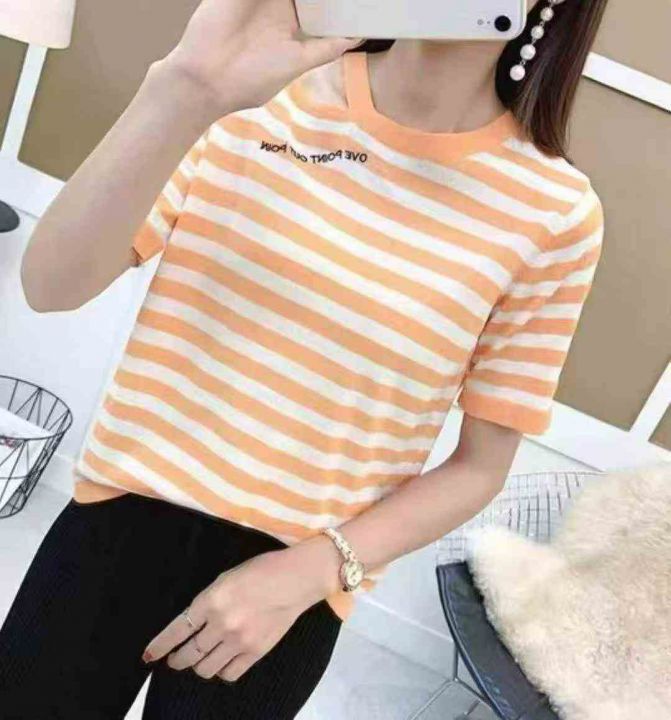 夏季新款撞色彩虹条纹网红爆款短袖针织衫,独立包装,均码面料柔软舒适弹力...