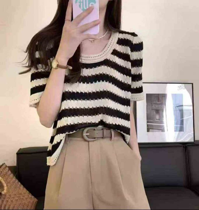 夏季新款冰丝宽松撞色条纹针织短袖,独立包装,均码宽松版,面料柔软舒适有...