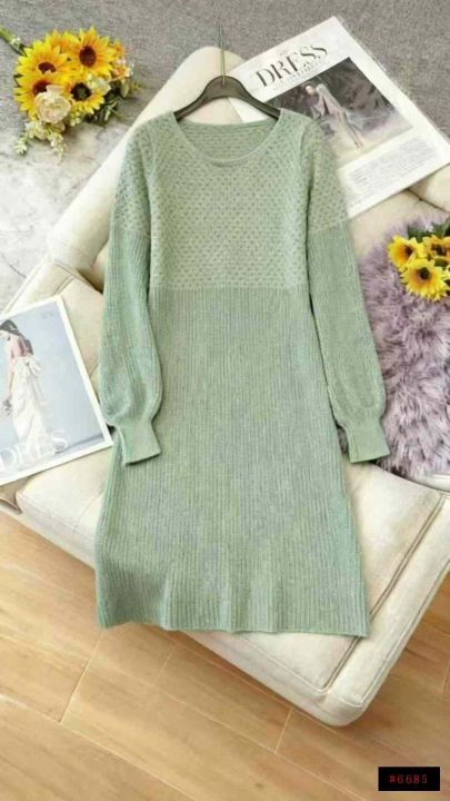 秋冬新欧美风宽松纯色粗针灯笼袖高腰A字圆领毛衣连衣裙,独立包装,码数S--...