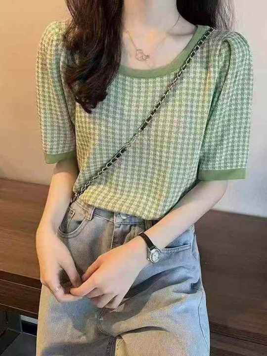 夏季新款冰丝法式独特别致质千鸟格针织短袖,独立包装,均码面料柔软舒适弹...