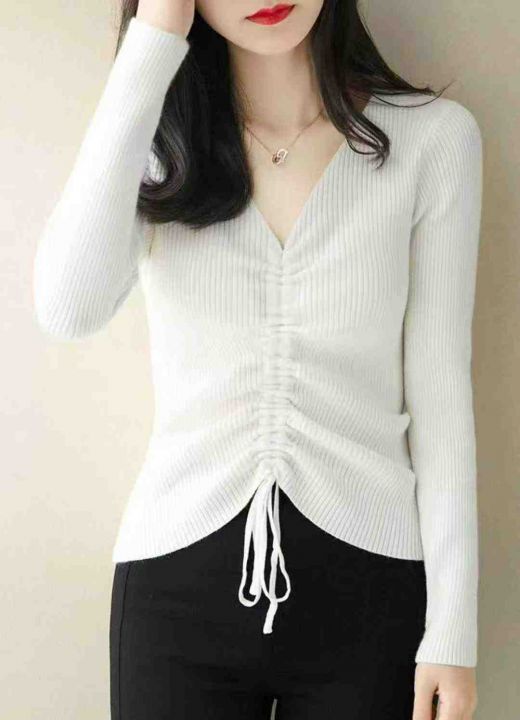 秋季新品韩版V领抽绳设计款包芯纱套头毛衣,独立包装,均码面料软糯舒适弹...