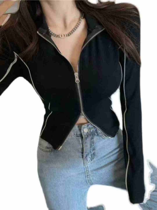 8.9清245件女装长袖T恤瑜伽服春秋季新款反光设计感双拉链设计感短款长袖上...