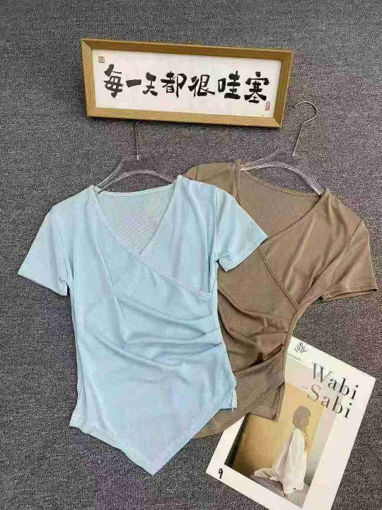 不规则冰丝短袖596件5.5面料柔软,高弹力,褶皱收腰,交叉V领设计,码数1-5...